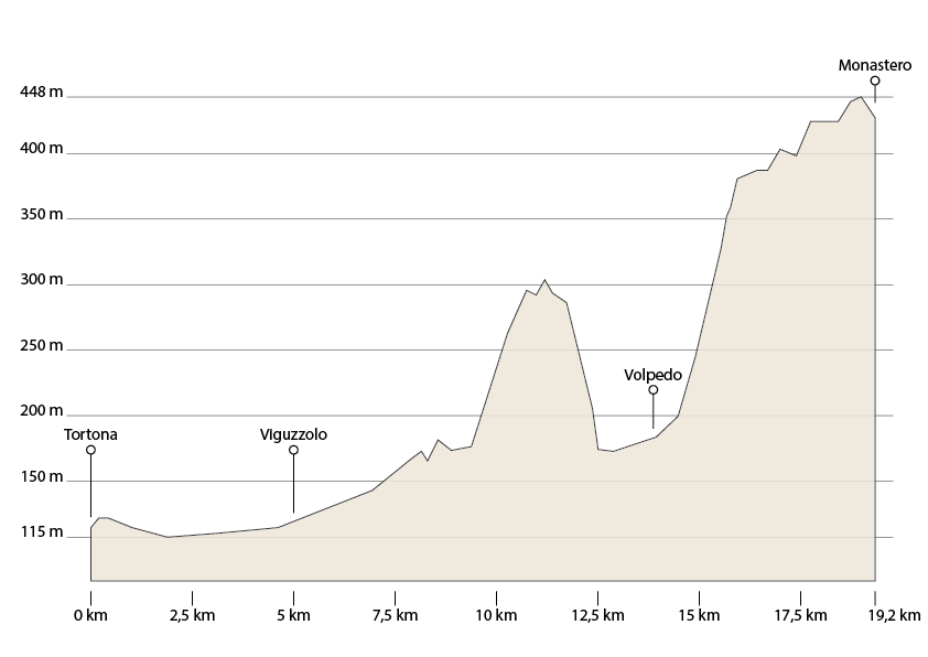 La prima tappa è in prevalenza pianeggiante, di difficoltà medio-bassa, se si esclude qualche salita verso la metà del cammino e nel tratto finale. Il percorso si snoda ai piedi delle colline tortonesi tra le quali si aprono le valli Grue e Curone che discendono dai rilievi dell’Appennino più prossimi alla pianura. L’intero tracciato, che presenta parti su asfalto e parti su sterrato, è adatto anche alla mountain bike.