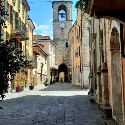 Il borgo conserva intatto l’antico impianto medievale, ben leggibile nel reticolo irregolare di strette e ripide vie su cui si aprono bassi porticati, alternate a case quattrocentesche in pietra a vista, con voltoni, porticati e piazzette. Sono ancora visibili le tracce dei tre antichi ordini di mura, di cui sopravvivono la porta orientale e quella occidentale, entrambe sormontate da torri (vedi sotto). Sono numerose le botteghe dove trovare i prodotti locali (salame, torta di mandorle, funghi, mele, pere, formaggi,ecc.) e artigiani: alcune delle serrande dei negozi sono diventate opere di street art.